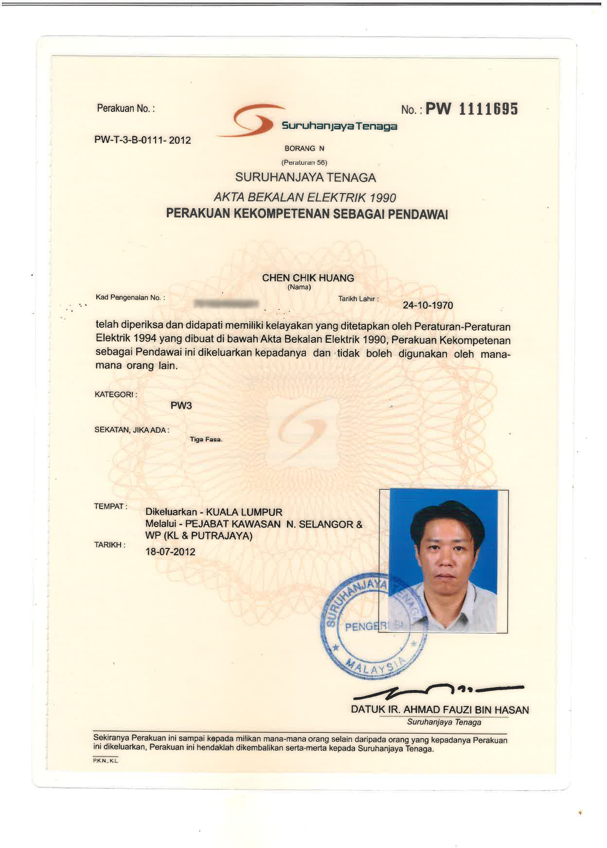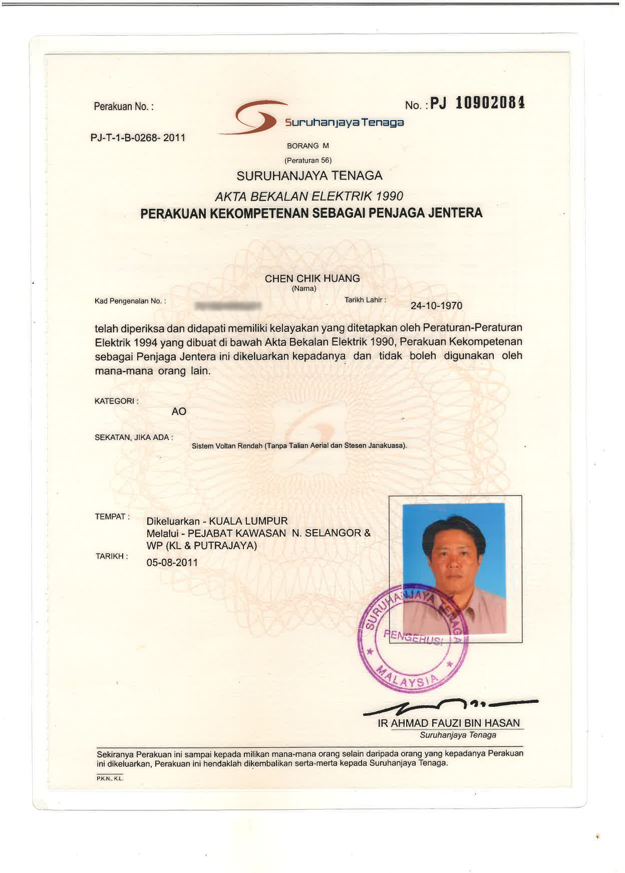 Chen holds a Diploma in Electronics from the Federal Institute of Technology and various professional certifications, including Wireman PW3 and Penjaga Jentera Elektrik A0 from Suruhanjaya Tenaga. His technical acumen and strategic approach have been instrumental in managing large-scale projects, particularly in the mechanical and electrical engineering domains.